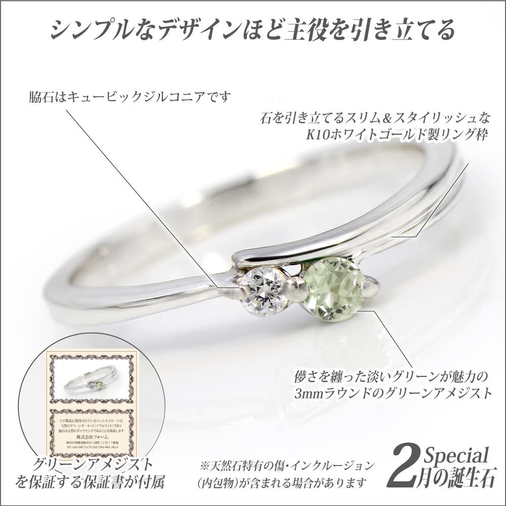 ・素材:K10ホワイトゴールド( K10WG) ・使用主石: グリーンアメジスト(プラシオライト・処理石) 3mmラウンドカット ・脇石:キュービックジルコニア(人工石) ・リング幅:4.0〜1.7mm ・重量:約2.1g(11号)淡いグリーンが魅力のグリーンアメジスト。