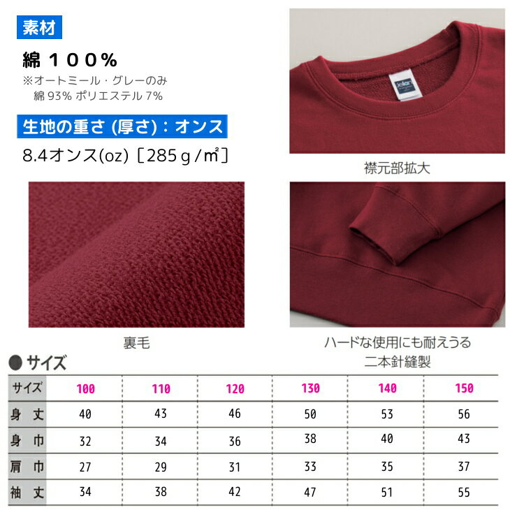 カラフルな色使いで、とても見栄えのする色味なので、 『あれ?!うちの子どこ?!』 と、イベントで見失いがちなお子様の居場所も、 瞬時に見つけられるかも?! 【メール便配送】不可(宅配便でのお届けとなります) 【商品詳細】無地トレーナ 【サイズ】 大人 : 100/110/120/130/140/150 【 素材 】綿100% ( コットン ) ※杢グレー・オートミールは、綿93%、ポリエステル3% 【 生地の重さ(厚さ) 】8.4オンス ( 285グラム/平方メートル ) 【 生産 】Chinaその他トップスはこちらをクリック その他プリントトレーナーはこちらをクリック☆