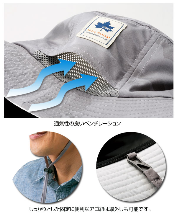 製品仕様 カラー クロ系/グレー系 サイズ(約) 本体/33cm、ツバ/6cm、適応サイズ/58cm 重量(約) 60g 素材 本体/ポリエステル100%、メッシュ部分/ポリエステル100% 仕様 撥水加工、サイドベンチレーション、紐(取り外し可) 生産国 中国通気性抜群!本格アドベンチャーハット LOGOS アドベンチャーハット 人気アウトドアブランド「LOGOS(ロゴス)」のアドベンチャーハット はっ水加工が施され、サイドには通気性のよいベンチレーションを搭載した本格派アドベンチャーハット。