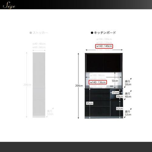 ◆キッチンボード【外寸サイズ】W140:幅140 奥行52 高さ208cm【内寸サイズ】・オープン部分内寸W140:幅136 奥行50 高さ50cm ※1500W2口コンセント2つ付き・スライド棚部分内寸 各サイズ共通:幅37 奥行40 高さ30cm ※1500W1口コンセント付き・スライド棚下収納部分内寸 各サイズ共通:幅37 奥行42.5 高さ44cm・食器収納部分内寸 W140:幅136 奥行27.5 高さ57cm※6cmピッチ調整、可動棚4枚付き※真ん中に仕切あり、収納部は左右に分かれます ・4杯引出収納部分内寸<共通> 最上段:幅47 奥行42.5 高さ10cm 2段目:幅47 奥行42.5 高さ18cm 3段目:幅47 奥行42.5 高さ18cm 最下段:幅47 奥行42.5 高さ25.5cm\\\\\<W140>上段:幅27 奥行42.5 高さ26.5cm下段:幅27 奥行42.5 高さ16cm【製品重量】 W140:145.2kg【梱包サイズ/梱包重量】 各サイズ2梱包・W140幅142 奥行38 高さ115cm 幅148 奥行61 高さ5cm 幅142 奥行52 高さ96cm 158.3kg【材質】 本体:(前面)クリスタルハイグロスプリント化粧繊維板(EBコート仕上げ) (側面)プリント化粧繊維板オープン部天板:アクリル人工大理石(UV塗装仕上げ)ガラス:3mm厚ガラス【カラー】 ブラック/ホワイト【生産国】日本【完成品】※サイズ・重量は概算になります。