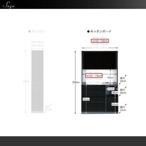 ◆キッチンボード【外寸サイズ】W120:幅120 奥行52 高さ208cm【内寸サイズ】・オープン部分内寸 W120:幅116 奥行50 高さ50cm ※1500W2口コンセント2つ付き・スライド棚部分内寸 各サイズ共通:幅37 奥行40 高さ30cm ※1500W1口コンセント付き・スライド棚下収納部分内寸 各サイズ共通:幅37 奥行42.5 高さ44cm・食器収納部分内寸W120:幅116 奥行27.5 高さ57cm※6cmピッチ調整、可動棚4枚付き※真ん中に仕切あり、収納部は左右に分かれます ・4杯引出収納部分内寸<W120> 最上段:幅67 奥行42.5 高さ10cm 2段目:幅67 奥行42.5 高さ18cm 3段目:幅67 奥行42.5 高さ18cm 最下段:幅67 奥行42.5 高さ25.5cm・引き出し収納部分【梱包サイズ/梱包重量】 各サイズ2梱包・W100幅102 奥行38 高さ115cm 幅108 奥行61 高さ5cm 幅102 奥行52 高さ96cm 111.1kg【材質】 本体:(前面)クリスタルハイグロスプリント化粧繊維板(EBコート仕上げ) (側面)プリント化粧繊維板オープン部天板:アクリル人工大理石(UV塗装仕上げ)ガラス:3mm厚ガラス【カラー】 ブラック/ホワイト【生産国】日本【完成品】※サイズ・重量は概算になります。